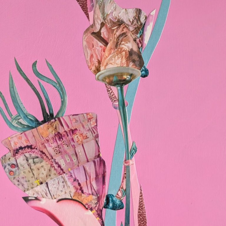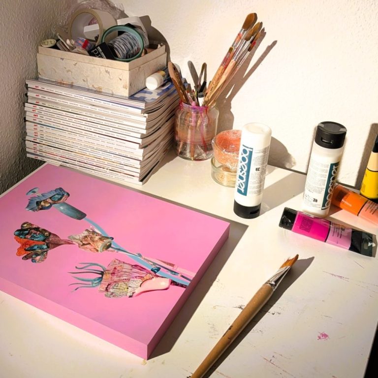 Meine Arbeiten entstehen aus Collagen, die ich aus Magazinen schneide und auf bemalte Holzplatten aufbringe. Die Holzplatten auf denen sie wachsen, grundiere ich mit satten Acrylfarben. So öffnen sich farbige Räume, in denen die Collagen wie Blüten treiben - manchmal nah an der Natur, oft aber ganz frei erfunden. Durch die Kombination aus gefundenen Bildern, Farbe und Form entstehen florale Kompositionen, die zwischen Abstraktion & Dekoration changieren.